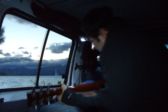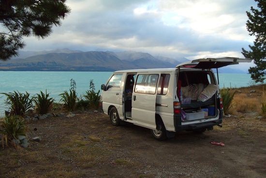 15.-16.02.09 - Hier wollten wir eigentlich nur durchfahren, um einen Abstecher an die Seen zu machen, aber es war so traumhaft schön, dass wir uns ein gemütliches Plätzchen zum Wildcampen suchten. Diesen Platz werd' ich glaub ich im Leben nie mehr vergessen. Es war perfekt. Direkt am See, menschenleer, mit windgeschützter Kochecke und Blick auf den majestätischen, schneebedeckte Mount Cook. Tobi konnte seine Gitarre endlich mal auspacken, nachdem wir gemütlich zu Abend gegessen hatten (Bratkartoffeln vom Gaskocher).