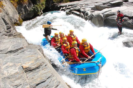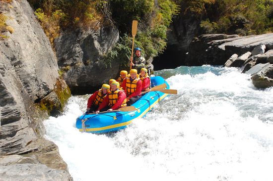 17.02.09 - Nach dem gestrigen Extremnervenkitzel, lassen wir es heute etwas ruhiger angehen, und gehen zum Schlauchbootfahren. Obwohl wir alle drei noch nie an einer Wildwasserraftingtour teilgenommen haben, bucht Sven die Fahrt auf dem Shotover River, mit der Einstufung 4-5 dem schwierigsten aller Flüsse der Gegend. Bevor wir das Schlauchboot betreten, erfahren wir, dass es 6 Einstufungen gibt. 1 ist ein nicht fließendes Gewässer und 6 ist ein nicht befahrbares Gewässer. Als Beispiel für die Stufe 6 werden die Niagarafälle genannt. Würde irgendjemand mit einem Schlauchboot die Niagarafälle runter fahren, dann würden diese automatisch auf 5 runtergestuft werden. Na ja, sehr vielversprechend, was die vor uns liegende Fahrt angeht. Aber wir sind gestern mit dem Lachs fertig geworden, dann wird das hier auch kein Problem für uns sein. Erschwerend kommt jedoch die Besatzung unseres Bootes hinzu. Neben uns drei Anfängern haben wir nämlich drei Australier an Bord, die am Abend zuvor ordentlich über ihren Durst getrunken haben. Der Restalkohol ist jedoch weniger beunruhigend als die Tatsache, dass Neuseeländer und Australier in einem ewigen Konkurrenzkampf zueinander stehen, weswegen die neuseeländischen Guides auf den anderen Boote auch bei jeder sich bietenden Gelegenheit versuchen, unser Boot zum Kentern zu bringen... Unglücklichweise hat das ein Guide auch gleich in den ersten Stromschnellen geschafften. Und zwar war das unser eigener Guide... Na das kann ja heiter werden. Stromschnellen der Stufe 4-5, 3 besoffene Australier an Bord und ein sabotierender Steuermann. Wenn das mal kein Glück ist. Trotz all dieser Handicaps, oder vielleicht gerade wegen dieser Handicaps hatten wir einen riesen Spaß! Die Fahrt ging durch wilde Passagen wie, "Die Toilette", "Die Schwiegermutter" und "Oh Sch....". Zum Anschluss ging es durch einen 170m langen Tunnel, der zu Goldgräberzeiten gegraben wurde, zu der wildesten Passage, den Kaskaden. Wow, fast so atemberaubend wie Lachsausnehming!