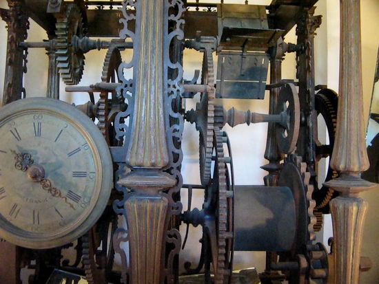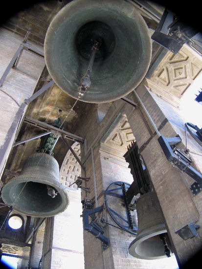 In der ersten Galerie sind 24 Glocken, darüber erhebt sich ein hohes Holzgehäuse mit den in der Karwoche statt der Glocken benutzten "Klappern".