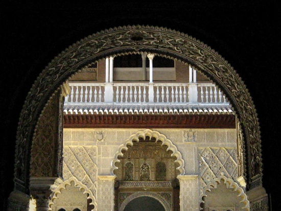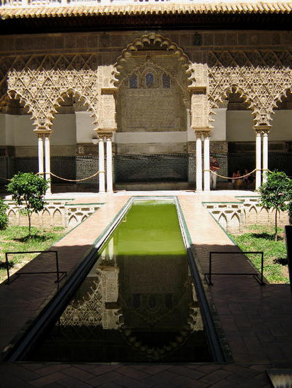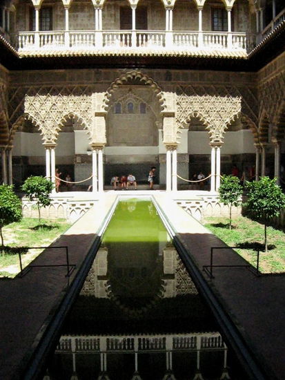 Der von 1369 - 1379 erbaute Patio de las Doncellas, der bezaubernde Mittelpunkt des Palastes, zeigt prachtvolle Zackenbogen und durchbrochene Oberwände, getragen von 52 Marmorsäulen, verspielten maurischen Dekoren und Formen.