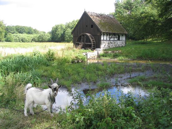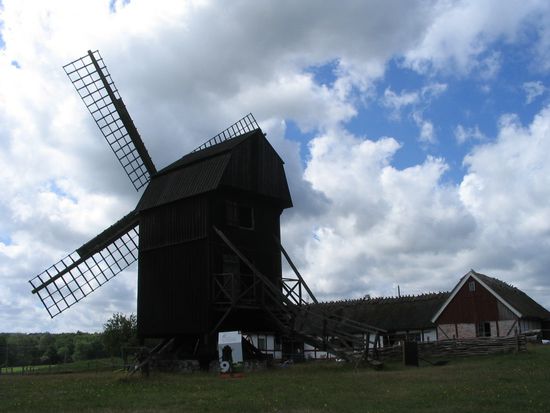 Im Tourist Info von Lund fragten wir nach dem Freilichtmuseum. Daß es das "Kulturen" hinter der Kathedrale war, konnten wir nicht glauben, verließen unverrichteter Dinge die Stadt und pilgerten Richtung Östarp bei Sjöbo. Dort gab es ein kostenloses Freilichtmuseum mit 3 Häusern, darin zahllose kleine nicht-scheue Katzen und eine Windmühle, Ziegen, Kühe. In den Häusern offen mit vollem Inventar von alten Möbeln. Die Häuser sind videoüberwacht und streng kontrolliert.