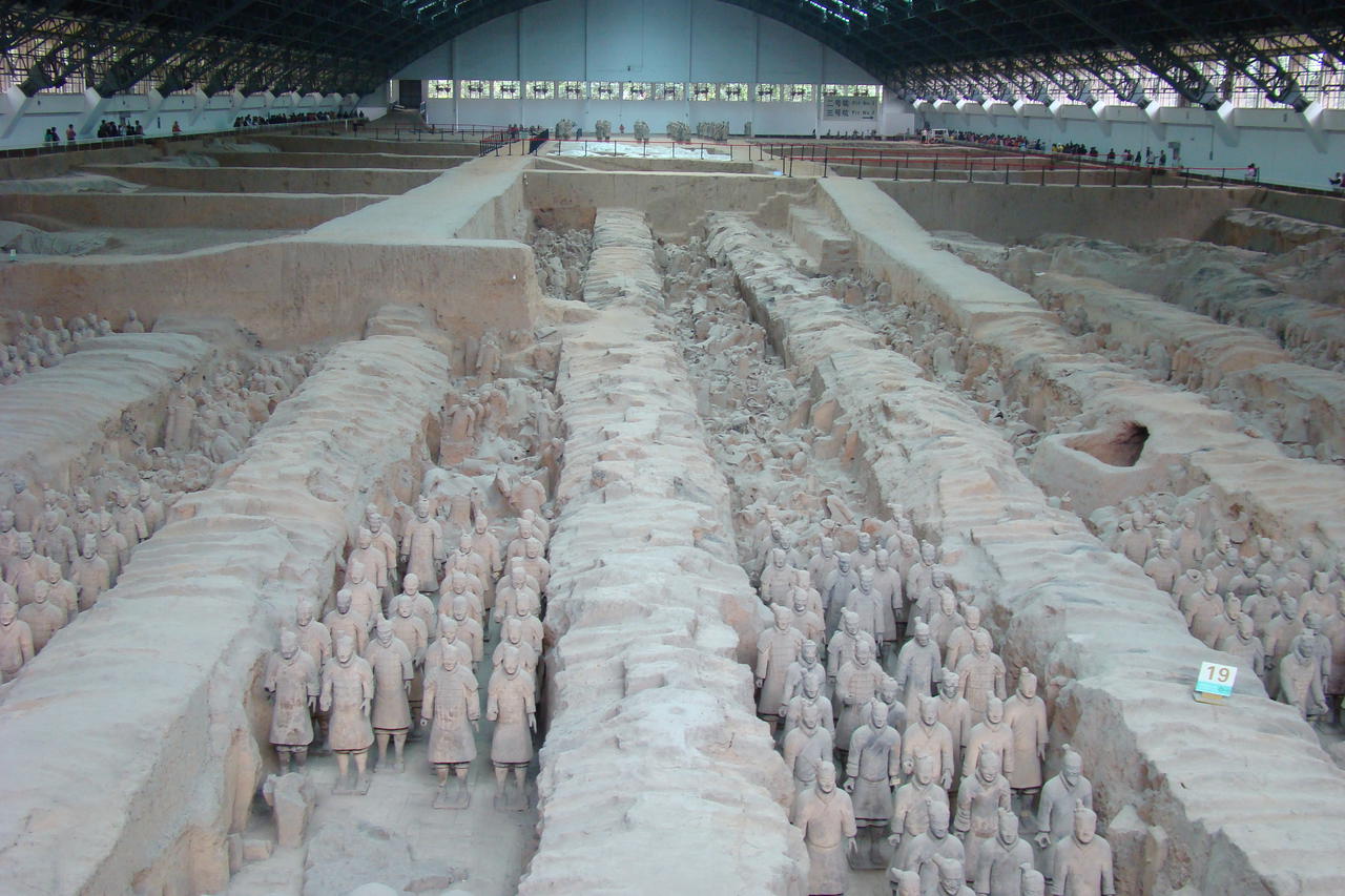 Xian ist eine typische chinesische Grossstadt mit ca. 4 Mill. Einwohnern. Die Stadt war unter der Qin Dynastie die erste Hauptstadt des Kaiserreichs in China. Wie anscheinend ueberall in China herrscht auch hier totales Verkehrschaos, die Hupe ersetzt Bremse, Blinker und macht jede Verkehrsregel zu nichte. Da helfen selbst 2 zusaetzlich an einer Ampelkreuzung stehenden Verkehrspolizisten, die wild in ihre Trillerpfeiffen pusten, nicht. Von hier aus sehen wir uns die Terrakottaarmee an, die der dahmalige Kaiser Qin errichten liess. Sie sollte ihm als Armee nach dem Tod dienen und weiterhin glorreiche Schlachten schlagen. Abends besuchen wir das muslimische Viertel, wo wir leckere Lamm-,und Huehnerspiesse vernaschen.