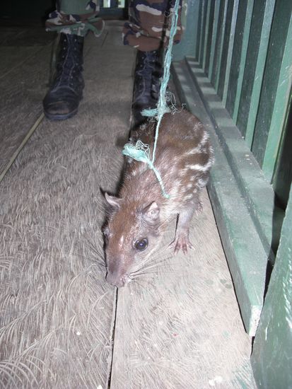 Ansonsten haben wir eine Schlange und viele Ameisen gesehen. Die Militaerstation, bei der wir uns, vor Parkeintritt, melden mussten, hielt dann nochmal eine kleine Attraktion bereit. Die hatten dort ein Paca (so hiess das Tier glaub ich)- es ist so eine Mischung zwischen Riesenratte und Reh.