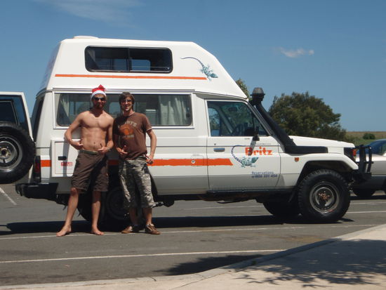 Im Britz Carcenter angekommen sahen wir zum ersten mal um welches Auto es sich bei der Ueberfuehung handelte. Ein Vierradangetriebener Gelaendewagen mit drei Schlafplaetzen und einer Campingkueche. Wir brachen fast in Jubel aus als uns in einer DVD alle Einzelheiten des Wagens erklaert wurden und sich heraus stellte was man mit dem Jeep alles so machen konnte. Zum Beispiel verfuegte der Wagen ueber einen grossen Frischwassertank der genug Wasser zum Kochen, Spuehlen oder Duschen lieferte. Neben einer kompletten Kuechenausstattung besass das Auto eine Propangassflasche mit der, an den Herd angeschlossen, wir in der Lage waren richtig zu kochen. Obendrein hatten wir natuerlich noch eine Kuehltruhe, einen zweiten im Auto integrierten Reservetank und einen 4,2 Liter Dieselmotor unter der Haube  der sich einfach grossartig anhoerte.