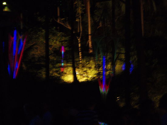 Überall rund um den Platz war leuchtende Floreszierende Deko in die Wälder eingearbeitet. Ebenso liessen sich viele Besucher mit leuchtender Farbe Bodypaintings verpassen. Das verlieh der Party eine ganz besondere Atmosphäre. Während wir ein paar Bierchen tranken und uns das Festivalgelände anschauten führte eine Gruppe von Feuerkünstlern eine super Show auf.