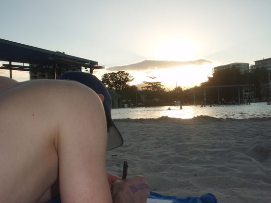 Die ersten 2 Tage haben wir Tagsueber erstmal alles besorgt was man so haben muss. Informationen, was essbares und so weiter... irgendwie war es garnicht so viel, aber der ganze tag war immer zu schnell rum! Die ersten beiden spaeten Nachmittage sind wir dann zur Lagune. So ner Art oeffentlichen Pool am Strand mit nem Teil Sand. Im Meer kann man hier leider net schwimmen. Also zumindest ist hier nirgends zugang! Hier hat Tobi dann auch angefangen, ein nach langer Suche endlich gefundenes tagebuch zu schreiben. Sowohl in Singapur als auch hier war es nicht so einfach einfach ein Heft zu finden!