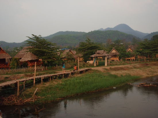 Wir stiegen die erste Nacht in einem kleinen guest house ab, wechselten am nächsten Tag aber in eine kleine süße Hüttensiedlung die nur über eine Wackelige Holzbrücke zu erreichen war. Die Hütte war nicht nur preiswert sondern hatte auch obendrein noch charm. So gab es zum Beispiel eine kleine Überdachte Aufenthaltshütte direkt am Fluss welche als Treffpunkt und zum Plaudern benutzt wurde . So lernten wir auch hier wieder relativ schnell Leute kennen.