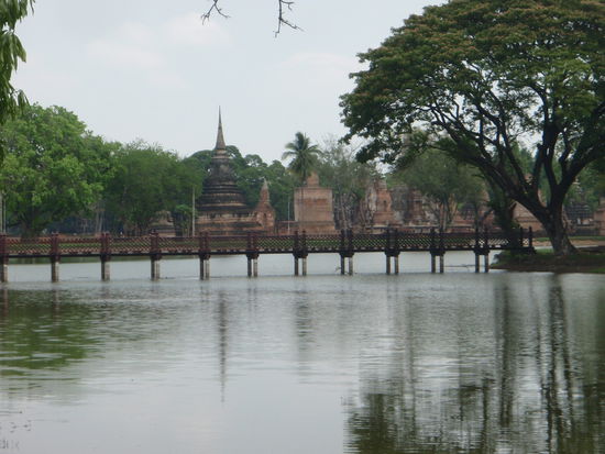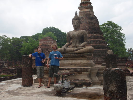 Dort angekommen mussten wir uns mit wiederwillen wohl oder übel, wie alle anderen auch, ein Fahrrad zu einem recht happigen Preis (für Thailand jedenfalls) ausleihen um die recht weitläufigen Tempelanlagen zu erkunden. Nochmal Eintritt für die Anlage selber bezahlt, kamen wir schon bald mit unseren super Rädern (Lagerschaden uvm) am ersten Tempel an. Mit freude trafen wir hier den Thai-Reiseführer wieder der uns am Abend vorher zu Bier und einem Snack eingeladen hatte. Er feierte gerade seinen Abschied als wir uns noch ein Bier auf den Tag gönnen wollten. Da er und sein Kumpel sehr gutes Englisch sprachen war dies eine Gelegenheit für uns gewesen endlich mal einen echten Thai die Fragen zu stellen die uns über die Zeit aufgekommen waren. Sitten und Gebräuche etc. Ein normales Gespräch war uns vorher nie so richtig untergekommen.