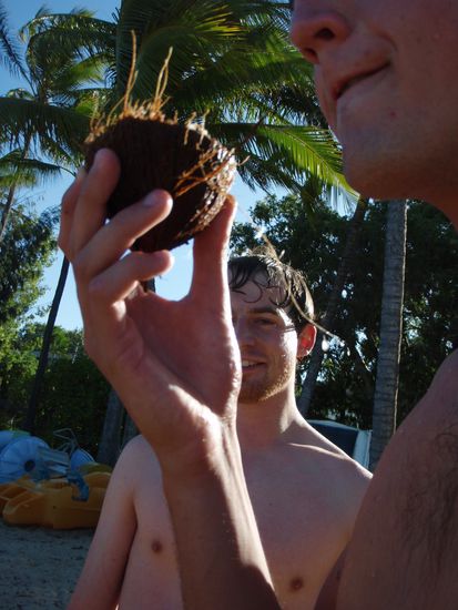 Ich hatte auf dem Weg zu unserer ausgewaehlten Liegestelle eine Kokusnuss gefunden! Das konnte ich mir ja natuerlich nicht entgehen lassen! An einem Stein hab ich dann erstmal die dicke Huelle geknackt und mit etwas Arbeit von der Kokussnuss wie man sie aus dem Supermarkt kennt befreit! Und dann kam die Nuss dran! Ich war ja schon ein bischen Stolz sogar noch Milch in der einen haelfte zu haben nachdem ich sie auf hatte Alle waren natuerlich begeistert die erste "wilde" Kokusnuss zu essen