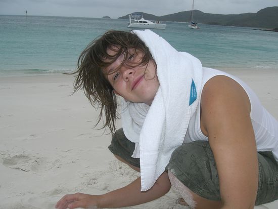 Am naechsten Tag waren wir am Whitehaven beach, das ist der Strand mit dem feinsten Sand der Welt. Normalerweise fuehlt sich Sand an wie Zucker, aber der Sand ist hier wirklich so fein wie Mehl, und wie tief man einsinken kann sieht man ja...