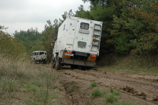 In Bursa suchen wir vergeblich nach den Thermalbädern, die in unserem Reiseführer beschrieben sind. Wir fahren kreuz und quer durch die Stadt, finden kein Schild, das auf heiße Quellen hinweist. Wir fragen bei Passanten und Taxifahrern nach. Niemand kann uns weiterhelfen. Enttäuscht wollen wir die Stadt wieder verlassen, da fährt ein Land Rover Defender an uns vorbei. Der Fahrer grüßt recht freundlich und winkt uns an den Straßenrand. Er fragt, ob wir gerne offroad fahren würden. Wir antworten mit ja und folgen ihm. Aus der Stadt draußen, biegt der Landy in einen Feldweg ein, der vom vielen Regen ganz aufgeweicht ist. Der Landy gibt Gas. Wir fahren mit Allrad und Sperren langsam hinterher. Es ist so schmierig, dass wir lieber wieder umdrehen wollen. Leonie und ich steigen besser aus. Das Heck vom Steyr tut, was es will. Es schleudert nach rechts und links. Marios Adrenalinspiegel schießt in die Höhe. Mit Schweißperlen im Gesicht erreicht Mario die Asphaltstraße wieder. Der Landy- Fahrer - er heißt Hüseyin - hebt einen Erdklumpen vom Boden auf und sagt: "This is spezial ground! It´s like chewing gum!" Tja, Mario weiß nun, wie es sich anfühlt, einen Achttonner auf Kaugummi zu fahren!