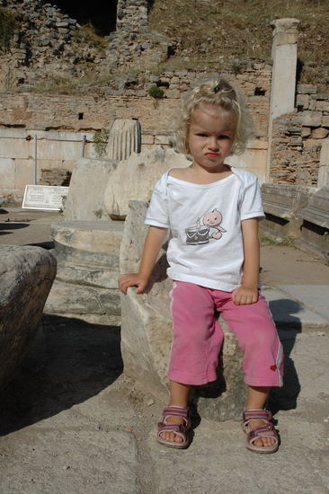 Wir besuchen die altgriechische Stadt Ephesos (Efes). Die Ruinen des Artemis- Tempels aus dem 3. Jh. v. Chr. zählen zu den Sieben Weltwundern der Antike. Diesmal wird uns mehr geboten als in Dion in Griechenland. Säulen, Statuen, Tempel und Theater sind besser erhalten und imposanter. Leonie findet, wie ihr am Bild unten erkennen könnt, keinen allzu großen Gefallen an den Ruinen.