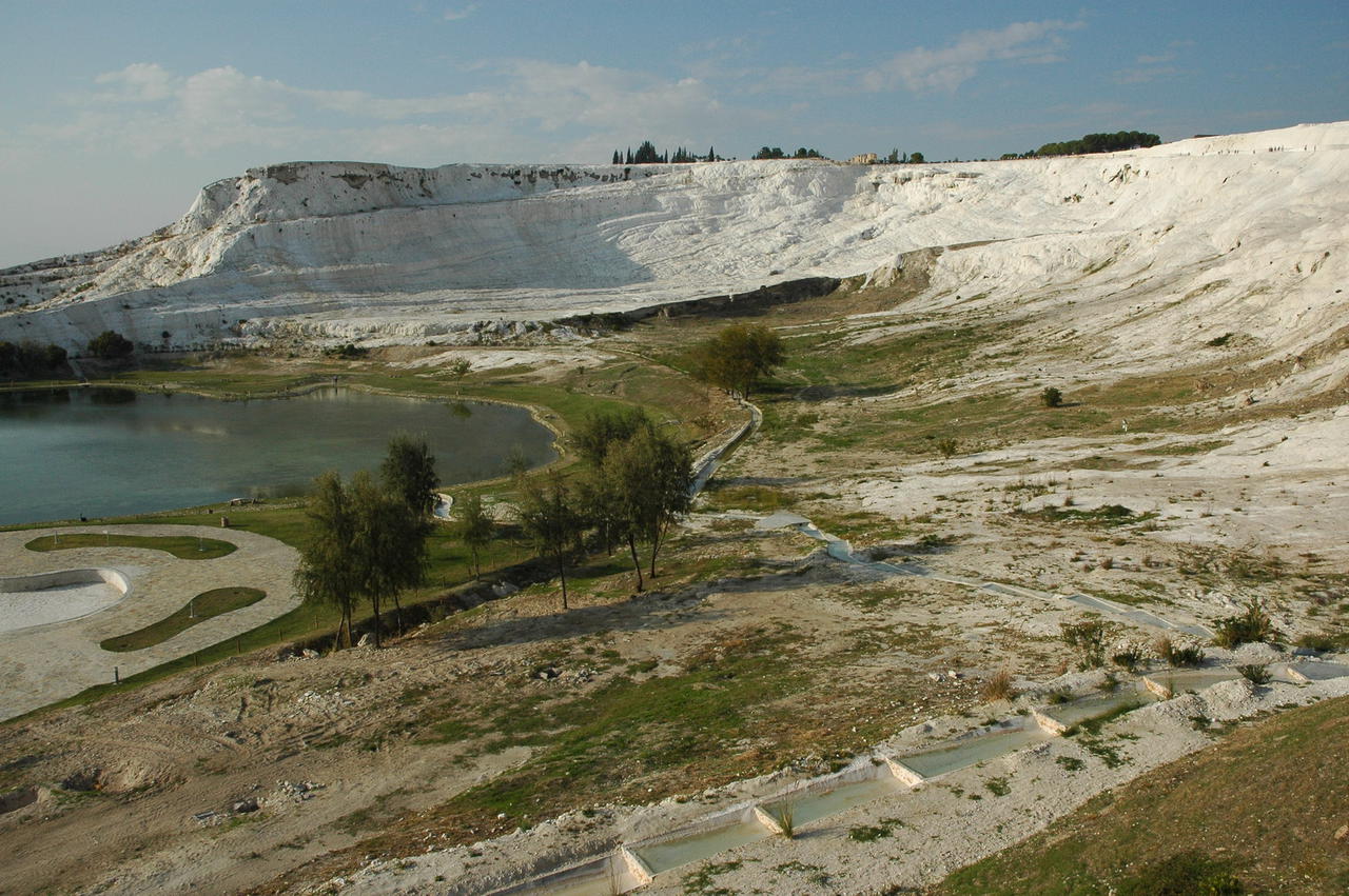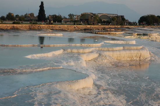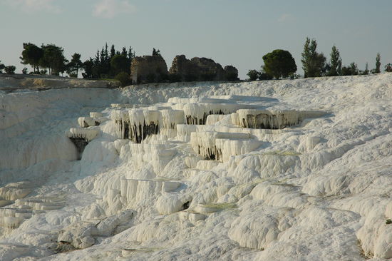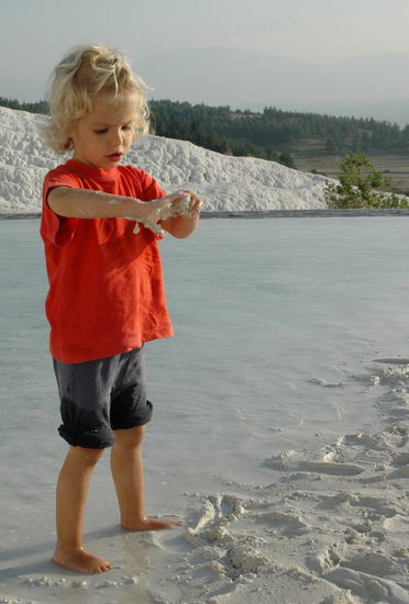 Gemeinsam sehen wir uns das "Baumwollschloss", ein faszinierendes Naturschauspiel, an. Es handelt sich um schneeweiße, terrassenartige Kalksteinbassins, die durch die Ablagerungen des kalkhaltigen Thermalwassers geformt wurden. Leonie marschiert voller Freude durch die Becken und schmiert ihre Arme mit Kalkschlamm ein.