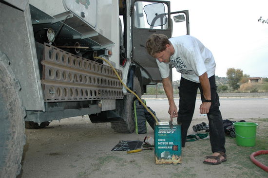 Zurück beim Lastwagen, entschließen wir uns, noch am gleichen Tag nach Pamukkale zu fahren. Wir kommen jedoch nur ein paar Kilometer, als plötzlich der Steyr bergauf ins Stocken kommt und abstirbt. Er will nicht mehr anspringen. Mario wirft einen Blick in den linken Tank und bemerkt, dass er trocken ist. Wir sind etwas verwundert, denn Mario hat vor zwei Tagen den linken Tank kontrolliert und da war er noch halb voll. Wir vermuten, dass sich jemand an unserem Diesel bedient hat! Mario muss baldigst ein Schloss an diesem Tankdeckel anbringen! Mario schaltet auf den rechten Tank um, öffnet die Motorhaube und fängt an zu pumpen, denn die Dieselleitungen sind leer. Er pumpt und pumpt, doch der Steyr lässt sich nicht mehr starten. Wir lassen den Steyr den Berg hinunterrollen, aber auch so klappt es mit dem Starten nicht. Erst im Tal bringt Mario den Laster nach mehrmaligem, kräftigen Pumpen wieder zum Laufen. Langsam fahren wir wieder los. Nach wenigen Kilometern nimmt der Steyr bergauf kein Gas mehr an. Das gleiche Problem hatten wir schon einmal in Griechenland. Mit Ach und Krach schaffen wir gerade noch den Berg. Wir fahren die nächste Tankstelle an und stellen den Lastwagen ab. Mario baut den Dieselvorfilter des rechten Tanks aus und sieht sofort, dass dieser völlig vom Rost verstopft ist. Mario entleert den Tank, wäscht ihn mit dem Hochdruckreiniger aus, leert dann den Diesel durch einen Filter wieder in den Tank zurück und baut einen neuen Vorfilter ein. Hoffentlich tritt dieses Problem nicht so bald wieder auf!
