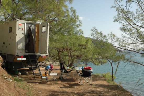 An diesem Tag schaffen wir es noch bis Cirali. Wir finden einen Stellplatz direkt am Meer unter riesigen Bäumen. Der Lastwagen erscheint unter den Riesen auf einmal ganz klein.