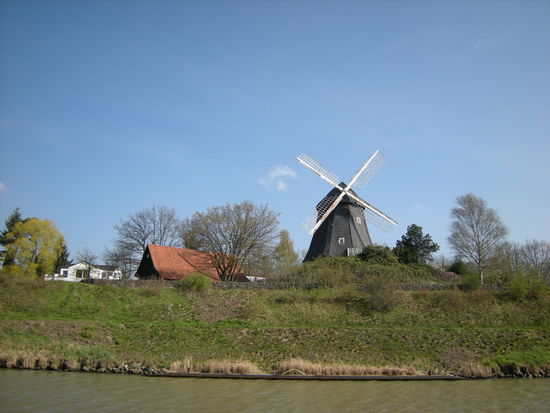 Die Kanalplaner scheinen ein großes Herz für Sportbootfahrer zu haben. Man fährt selten mehr als 5 km am Stück ohne einen Anlieger für Sportboote, einen Slip oder eine Einsatzstelle für Paddel- und Ruderboote zu finden. Oft sind die Spundwände für kleine Boote glatt verkleidet, so dass die Fender nicht in den Aussparungen verschwinden können. Auch Müll los zu werden ist kein Problem. Teilweise begleiten sehr hohe Dämme den Kanal und verhindern eine Aussicht ins Hinterland. Die deutsch- preußische Akkuratesse hat dem Kanal Bäume wie Orgelpfeifen verpasst. Eine Augenweide, wenn sich dazwischen eine wilde Kirsche mit weißen Blütenblättchen schmückt. Dort, wo die Ufer flach sind, erlauben sie einen Blick auf wahrhafte Gutshöfe, Gehöfte, Bauernhöfe, wunderschöne Backsteinhäuser mit roten Dächern. Moderne Windräder drehen sich in dem strammen Ostwind, der uns ins Gesicht pfeift und dazwischen steht auch schon mal eine alte, nostalgische Mühle, die man aber nur sehen kann, weil die Bäume noch unbelaubt sind. Die Fahrt ist eintönig, das kann man nicht wegleugnen.