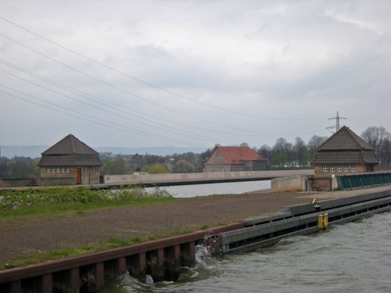 Die alte Kanalbrücke Minden ist wunderschön anzusehen, mit ihren nostalgischen Brückenhäuschen und den roten Sandsteinquadern, doch sie ist gesperrt, wir benutzen den neuen Trog um die Weser zu überqueren. Einkaufsmöglichkeiten sind auf diesem Stück dünn gesät. Ab Hannover ist Vorsicht geboten. Hier wurden bei der Verbreiterung des Kanals Spundwände stehengelassen, die meist unter Wasser sind. Anlegen nur an den ausgewiesenen Stellen. Auch nachts am Ufer liegend sollte man ein Ankerlicht setzen, damit die Berufsschifffahrt das Sportboot nicht übersieht. Obwohl rund um die Uhr geschleust wird, ist nachts wenig Betrieb auf dem Kanal.