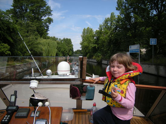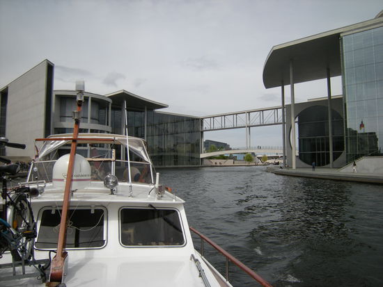 Wir biegen ein in den Hohenzollernkanal. Heute heißt er ein bisschen unromantisch Berlin-Spandauer-Schifffahrtskanal. Schnurgerade führt er zwischen grünen Ufern zur Schleuse Plötzensee, die uns einen stolzen halben Meter tief sinken lässt. Über Westhafenkanal und Charlottenburger Verbindungskanal erreicht man die Spree. Obwohl schon sehr nah an der Innenstadt ist es hier vielerorts immer noch ländlich grün. Doch dann kommt man aus dem Staunen nicht mehr raus. Supermoderne Hochhäuser mit spiegelnden Glasfassaden in erstaunlichen Formen wechseln sich ab. Bereits hier ist man schwer beschäftigt den Sightseeing Booten auszuweichen. Es geht unter vielen, sehr vielen Brücken hindurch, an Restaurantbooten, an Strandbädern und dem Bolle-Viertel mit seinen runden Türmen vorbei.