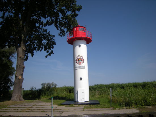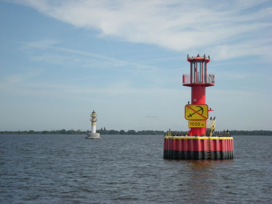 Als wir Stettin verlassen, bläst uns eine steife Brise entgegen. Die Ostsee ist nicht mehr weit. Hier muss man immer mit Wind rechnen. Ab dem Seehafen Stettin benötigt der Skipper den Sportbootführerschein See, den Küstenschein. Hier beginnt bereits die Betonnung nach Seeschifffahrtstraße. Die festen Seezeichen und die Tonnen sind teilweise befeuert. Die kleinen Leuchttürme haben Sektorenfeuer. Gut, dass sich mein Skipper damit auskennt, so kann ich mich beruhigt dem Fotografieren widmen. Viele Segelboote schwirren um uns herum. Angler dümpeln mit ihren Kähnen neben dem Fahrwasser. Ein Kümo überholt uns, das Tragflächenboot, das Linie fährt zwischen Swinemünde und Stettin, und ein Schweizer Hotelschiff kommen uns entgegen. Das betonnte Fahrwasser führt schnurgerade nach Swinemünde, dem seeseitigen Vorhafen von Stettin. An der Wasserteilungstonne biegen wir ab in das Fahrwasser von Ziegenort. Die Hafeneinfahrt ist betonnt. Als wir an der Mole anlegen hat der Wind bereits soweit aufgefrischt, dass Schaumkronen auf den Wellen tanzen. Auch im Hafen lässt der Wind die Boote hüpfen. Es gibt hier auch einen Jachthafen mit Service. Dort liegt man allerdings auch nicht ruhiger. 8 € an der Mole, mit Strom und Wasser, das lässt sich hören