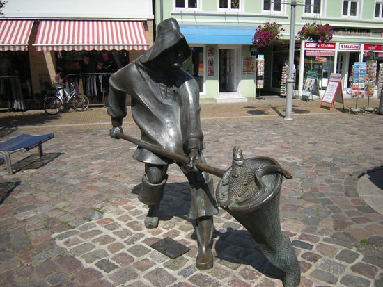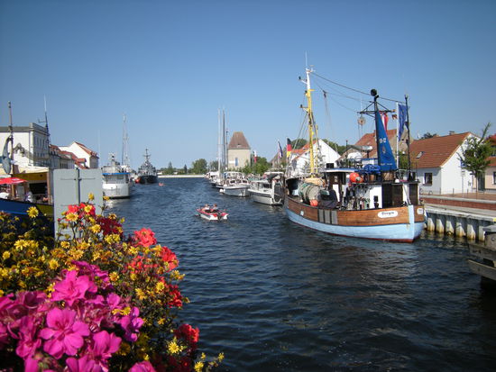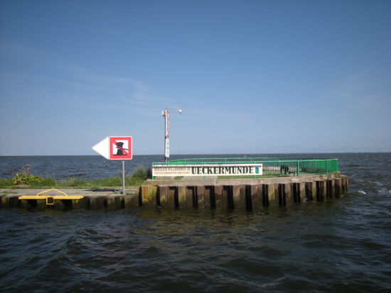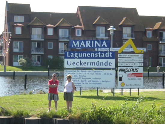 Um 10 Uhr erreichen wir die Mündung der Uecker. Jetzt sind die Wellen ca. 1 m hoch und es bläst kräftig. Die Segler haben ihr Tuch gerefft. Sie ist genau dieser Fluss, der der Uckermark ihren Namen gab und irgendwo an der unsichtbaren Grenze zwischen Mecklenburg und Vorpommern auf mysteriöse Weise ihren Namen von Ucker in Uecker wechselte. Auf dem Molenkopf des Ueckerkanals steht ein gut sichtbarer Leuchtturm. Liegt in dem engen Kanalabschnitt ein Berufsschiff, darf man nicht einfahren. Das Passieren der Fahrgastschifffahrt am Ueckerkopf ist nicht möglich. Ausfahrende Schiffe haben Vorfahrt. Kurz hinter der Einfahrt erreicht man die Marina Hafendorf Ueckermünde, aber das ist uns viel zu weit von der Stadt entfernt. Wir fahren die Uecker weiter bis in den Stadthafen mitten in die Stadt. Hier sind wir sehr zentral. An diesem Wochenende finden gerade die 45. Ueckermünder Hafftage statt. Ein Volksfest entstanden aus ernstem Hintergrund, weil sich polnische und deutsche Fischer vor 45 Jahren aus Seenot retteten. Wasser und Strom gibt es an der langen Hafenmole, und auch hier ist die Liegegebühr sehr fair. Noch ein Grund mehr dieses nette kleine, mittlerweile touristisch geprägte Örtchen zu besuchen.