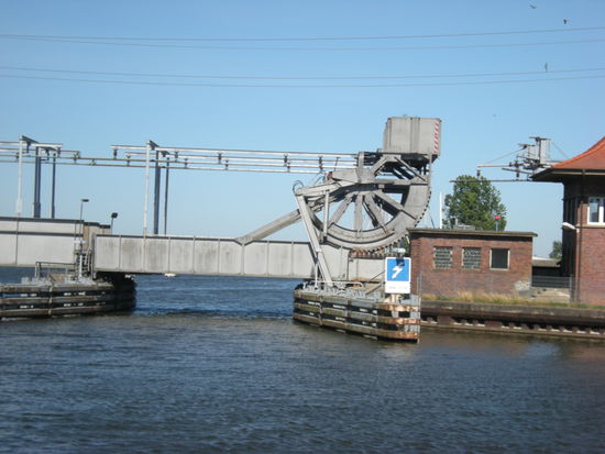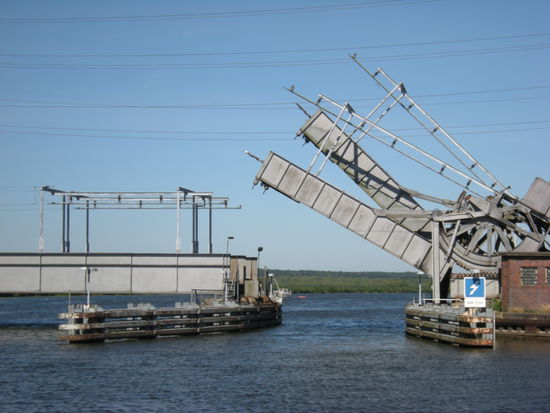 Torfige, moorige, ja sumpfige Böden umgeben die Schilf bewachsene Peene in ihrem Unterlauf. Nach einer Stunde Fahrzeit stehen wir vor unserem ersten Hindernis: die Eisenbahnbrücke hat nur eine Höhe von 1,80 m. Ihre Öffnungszeiten sind abhängig vom Fahrplan der DB und an einer Tafel abzulesen. Für uns hebt die 100 Jahre alte Brücke sogar zwischendurch. Zwischen Fußgängerbrücke und Straßenbrücke ist ein Kai, hier nennt man ihn Bollwerk, an dem man ohne Versorgung liegen kann. Es ist ein guter Ausgangspunkt um die Stadt zu besichtigen. Trotz einiger schön restaurierter alter Bauten sind wir ein bisschen enttäuscht. Wohnblocks dominieren das Stadtbild der ehemaligen Hansestadt und die Kirchen sind geschlossen. Otto Lilienthal wurde in Anklam geboren und studierte hier den Flug der Störche, der ihn zu seinen Gleitfliegern inspirierte.
