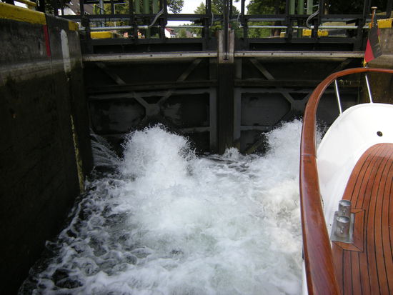 Auch vor der nächsten Schleuse haben wir wieder Aufenthalt. Vor der Einfahrt haben wir zweimal Grundberührung. Bis zu unserer Rückreise darf das Wasser nicht fallen.