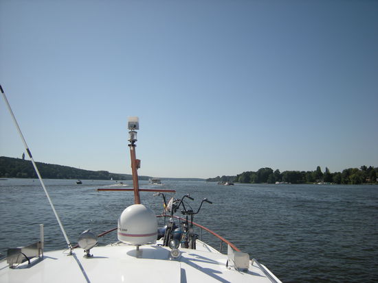 Berlin auf dem Wasser, das ist nicht nur Spree, das sind auch Scharfe Lanke, Marina Lanke, Havel und die Badewanne der Berliner, der Wannsee. Schön ist die Fahrt an Schwanenwerder und der Pfaueninsel vorbei. Blauer Himmel spiegelt sich im blauen Band der Seen. Es geht geschäftig zu. Viele Segler und Motorboote sind unterwegs, dazwischen die Weiße Flotte. An unserer Steuerbordseite die Heilandskirche am Schlosspark Sacrow. Vor uns die Glienicker Brücke, auf der zu Zeiten des kalten Krieges die Agenten getauscht wurden.