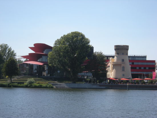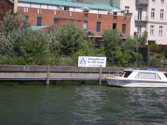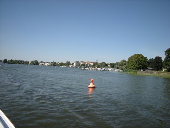Im Tiefen See das futuristische Hans-Otto-Theater, daneben eine Marina für bis zu 20 m lange Boote und der Anleger von Aldi Potsdam. Die Einfahrt zur Alten Fahrt hinter der Freundschaftsinsel ist vorübergehend gesperrt worden, es soll ein Wettangeln stattfinden. So gibt es derzeit keinen kostenlosen Anleger in Potsdam.