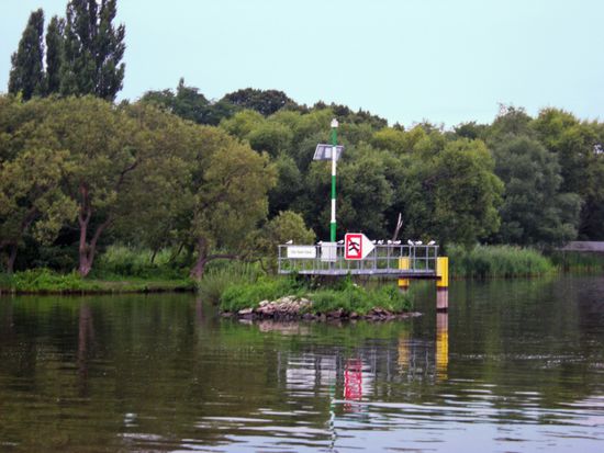 Die Havel zeigt sich weiterhin von ihrer schönsten Seite. Idyllisch mäandert sie durch Wiesen und Waldgebiet. Nie kann sie sich entscheiden wohin ihr Weg nun wirklich führen soll. Ihre Arme umschlingen unzählige Inseln, bilden Seen und Buchten. Es ist ein reiner Irrgarten. Um diese Seen und Seitenarme zu erkunden, hat der Skipper drei Möglichkeiten. Entweder er verzichtet gleich darauf und bleibt im betonnten Fahrwasser, oder das Boot ist so klein, dass er seinen Tiefgang vernachlässigen kann, oder er braucht eine gute Karte und ein topp funktionierendes Lot, denn diese seitlichen Gewässer können sehr flach sein und oft sind sie auch verkrautet. Außer einem Echolot ist auch ein Geschwindigkeitsmesser auf den Brandenburger Seen unverzichtbar. Wer kann schon genau 6 km/h abschätzen, außer der Blitzlichtlampe der Wasserschutzpolizei. Sie ist hier sehr präsent und es sei jedem Skipper angeraten sich an die Verkehrsschilder am Ufer zu halten. Wusstet ihr eigentlich, dass bereits die alten Römer ein Patentlog hatten? Sie zogen Schaufelräder hinter ihren Schiffen her, deren Umdrehungen es ihnen ermöglichte die Entfernung zu schätzen. Ein waches Auge muss man auf die vielen Netze im Wasser haben, ihre Fischstäbchen, verengen manchmal sogar das betonnte Fahrwasser.