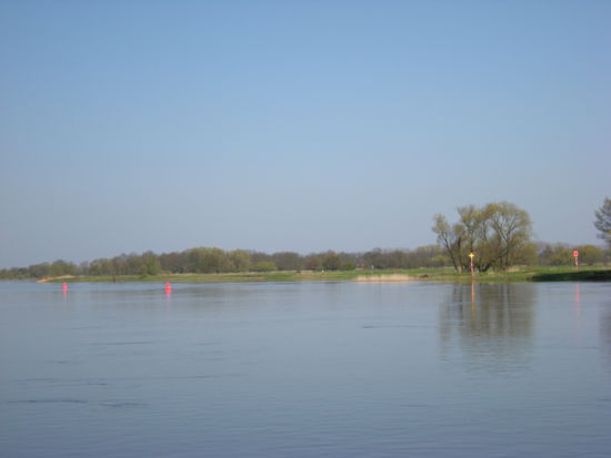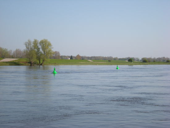 Die Rothenseer Schleuse bringt uns vom Mittellandkanal über den Verbindungskanal zur Elbe bei km 333+. Sie empfängt uns mit 2 m Wasser über Normal. Ufer und Buhnen sind nicht so recht auszumachen. Ihre Beschilderung und Betonnung unterscheidet sich vom Rhein und seinen Nebenflüssen. Um ohne Pannen und Grundberührung über die Elbe zu kommen, sollte man ihre Eigenarten kennen. Die Fahrrinne mäandert in dem breiten Fluss. Wenn das Fahrwasser die Richtung ändert, stehen am rechten Ufer gelbe Kreuze und rote Vierecke und im Wasser liegen zwei rote Tonnen dicht neben einander. Auf der linken Uferseite sind ein grüner Rombus, ein gelbes Andreas-Kreuz am Ufer und zwei grüne Tonnen im Fluss. Man bleibt immer so lange auf einer Seite, bis sich das Kreuz wiederholt, dann wechselt man Richtung Kreuz der anderen Flussseite. Zusätzlich zur Betonnung im Fluss stehen auf den Buhnen Baken, die jeweils eine liegende, schwimmende Tonne neben sich haben. In unserer Flusskarte (Elbe 2 Heel-Verlag) hat Andreas Saal die Fahrrinne und die praktische Anwendung der Beschilderung gut beschrieben.