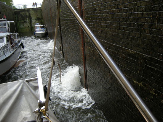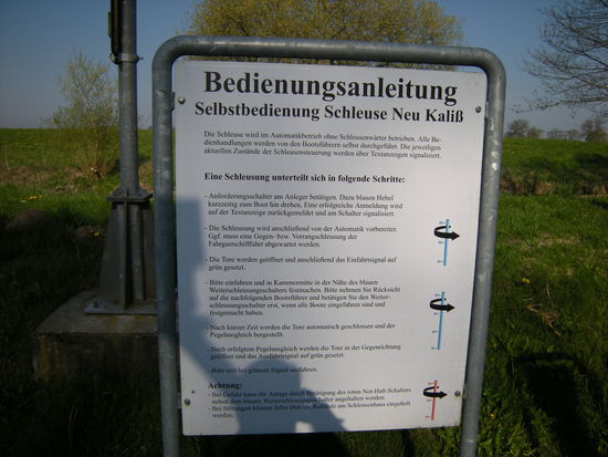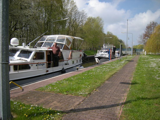 Bis zur Schleuse Neu-Kaliß haben wir ständig 1,5 m Wasser unter dem Schiff. Erst im Schleusenkanal zeigt das Echolot kurzfristig 50 cm. Diese Schleuse und Dömitz haben Spundwände. Vor den Schleusen sind Warteplätze eingerichtet, die man auch benötigt, weil sich die Automatik-Schleusen sehr behäbig in Betrieb setzen. Auch der Schleusenvorgang selber bringt die Boote nicht in Schwierigkeiten. Durchgängig haben wir jetzt 1 Meter Wasser unter uns.