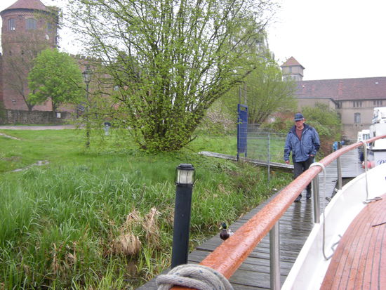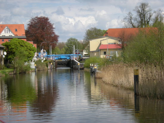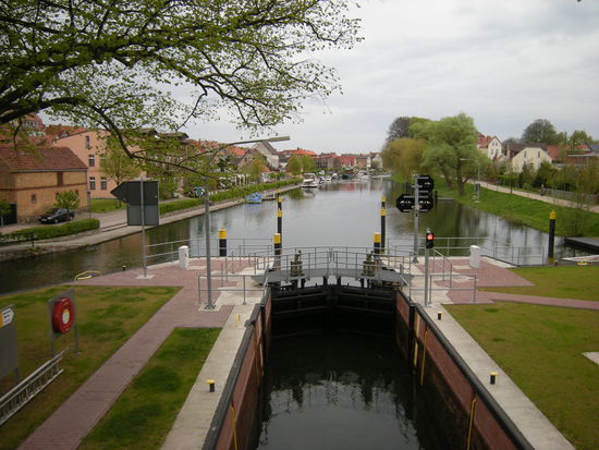 Zwischen Lübz und Plau haben wir streckenweise nur 40 cm Wasser unter dem Boot. An den ausgebaggerten Abschnitten sind es 1 m und mehr. Der Schleusenmeister der Schleuse Plau ist auch für die Hebebrücke zuständig. Normalerweise öffnet er die Brücke 3 Minuten nach der Schleuse, erklärt er uns, doch heute wird es etwas länger dauern, denn im Oberwasser steht eine holländische Hotelpenische, die hat Vorrang und muss erst noch geschleust werden. Wir wollen aber gar nicht weiter. Der kleine Luftkurort Plau mit seiner hübschen Altstadt ist uns einen Tag Aufenthalt wert. Besser zum Liegen als der flache Kai im Oberwasser, der eigentlich von Einheimischen voll belegt ist, ist ein Steg im Unterwasser der Schleuse. Hinter der Hubbrücke findet man auch eine Marina, aber da ist es wegen der vielen Ausflugsboote am anderen Ufer recht unruhig. Bis hierher hatte die Elde im April 2008 einen Wasserstand nicht unter 1,60 m.