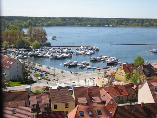 "Ich kann Ihnen auf der ganzen Gotteswelt keinen besseren Platz empfehlen, als die graue Stadt am Meer...", schwärmte Theodor Fontane als er 1896 die Stadt Waren besuchte. Heute ist die Stadt nicht mehr grau. Wie bunte Legosteine gruppieren sich die Häuser um die Kirche und den Stadthafen. Es ist ein Bild mit mediterranem Flair. Bereits jetzt, Anfang Mai, ist der Hafen knallvoll. In der Urlaubszeit ist hier kein Platz zu bekommen, erzählt der Hafenmeister, als Manfred seine 19 € hinblättert. Strom gibt's dann aus dem Automat für 50 Cent 1 KW. Sie haben schnell von uns gelernt den Kapitalismus umzusetzen! Trotz des Preises ist die Stadt einen Besuch wert. Im Mai findet die Müritzsail statt, da ist ganz Waren im Wettkampffieber, und die Stadt mit 60.000 Besuchern verstopft. Von Anfang Juli bis Anfang September wird von freitags bis sonntags im Freilichtmuseum Bürgerpark Mühlenberg die Müritz-Saga aufgeführt.