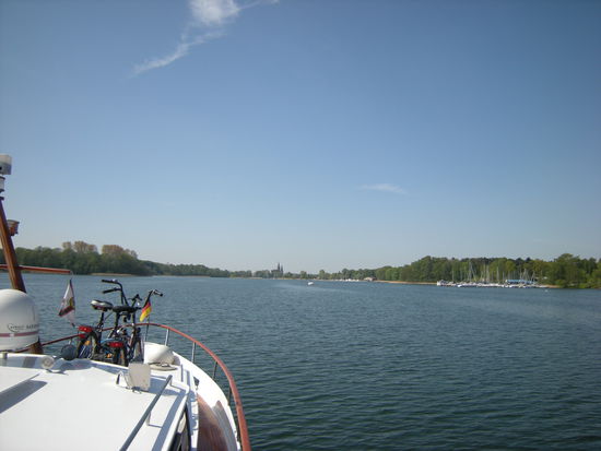 Nur ein paar Minuten weiter, ich habe kaum meine Taue nach dem Ablegen klar und die Fender aufgeräumt, erscheint im Morgendunst der Glockenturm von Waren. Sonne und blauer Himmel spiegeln sich im Wasser der Binnenmüritz. Man hält den Atem an und staunt.