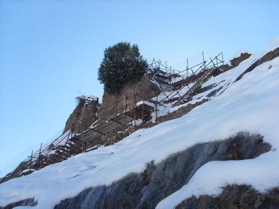 Dort hatte es in der Nacht geschneit und die Arbeiter, sonst teilweise mit Ausgrabungen und Restaurierungen beschäftigt, waren dabei Schnee zu schippen. Den Berg hinauf zuerst ein kleiner Pfad, den man sich auch per Esel hinaufführen lassen kann, der dann in eine Betontreppe, bzw. Stufen übergeht um dann, an der Burg angelangt, in einer Treppenkonstruktion aus Baugerüsten endet. Vor dem Hauptteil der Burg ist ein Loch in einem Felsrücken, so dass man auf die andere Seite gelangen kann, um die Aussicht auf das Dorf und die Landschaft zu genießen.