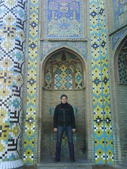 Wir sind am Donnerstag morgen aufgebrochen und mit dem Stadtbus zum Westbusbahnhof Teherans gefahren, der direkt am Freiheitsmonument(s. erstes Kapitel) liegt. Vom Stadtbusterminal sind es ein paar Schritte zum Fernbusterminal, wo wir uns erstmal durchfragen mussten. In Iran sind Busse das Hauptverkehrsmittel für mittlere und weitere Entfernungen. Es gibt ungefähr 20 große Busgenossenschaften und weitere lokal agierende Busunternehmen. Das Streckennetz ist sehr dicht und es gibt zwei Klassen von Bussen: Erstens topmoderne Reisebussen und zweitens ältere Reisebusse, meistens Mercedesbusse aus den 60er Jahren. Sie sind äußerst günstig, so haben wir für die Hinfahrt ~1,4 Euro und für die Rückfahrt in einem Bus "zweiter Klasse" nur ~0,75Euro für immerhin 150 Kilometer bezahlt. Nach einigem Fragen haben wir herausgefunden, dass der Bus nicht direkt am Hauptterminal, sondern an einem kleineren Terminal für kürzere Strecken abfährt. Von diesem Terminal fahren sowohl Busse als auch Sammeltaxis ab. Die Sammeltaxis kosten mehr, sind aber schneller. Wer den iranischen Verkehr kennt, weiß warum wir Busse bevorzugen: Man fühlt sich einfach sicherer, wenn man weiter vom Straßengeschehen entfernt sitzen kann. Auf den Straßen herrscht weithin das Recht des Stärkeren, d.h. dass das größere schwerere Fahrzeug Vorfahrt hat, also ein weiterer Grund für den Bus. Die Busse auf den kurzen sehr gefragten Strecken fahren ab, wenn sie voll sind, was auf dieser Strecke nicht mehr als 15 Minuten dauern soll. Wir haben nicht so lange gewartet. Vor der Fahrt ging der Busfahrer durch den Bus und hat das Geld eingesammelt, ein Kontrast zu den vernetzten Buchungssystemen der Fernbuslinien. Die Fahrt dauerte zwei Stunden und war interessant. Zuerst ging es auf der Autobahn durch Vororte bzw. Industriegebiete Teherans, die ich teilweise schon von der parallel verlaufenden Vorortbahn gesehen hatte. Das Interessante an dieser Strecke ist der Kontrast. Sie verläuft in etwa parallel zum Alborzgebirge, d.h. man hat im Norden sehr hohe karge Berge, die hinter einem schmalen bebauten oder bewaldeten Streifen beginnen und im Süden eine Flache Ebene, Ausläufer der Wüsten des iranischen Hochlandes, die dort soweit das Auge reicht bebaut ist. Noch beeindruckender ist allerdings die Bahnstrecke, die Teheran in Richtung Osten verlaesst. Die Bahnstrecke verläuft ebenfalls parallel zum Alborzgebirge. Dort ist die Ebene aber nicht bebaut, sondern wirklich Wüste und die Berge steigen noch steiler an. Die Busfahrt wurde mehrmals unterbrochen durch Fahrtenschreiberkontrollen und aussteigende Mitreisende und endete in Qazwin an einem neu errichteten Busterminal. Dort konnten wir gleich das erste historische Stadttor besichtigen, nachdem wir alle Angebote der Taxifahrer uns in die Stadt zu fahren abgelehnt hatten. Das Tor wurde in den 1870er Jahren errichtet und ist mit bunten Kacheln verkleidet