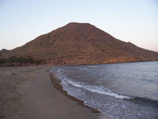 Kurz gesagt fanden die Jungs den Strand ebenfalls so klasse, wie ich bereits am Vortag. Les und ich haben an dem Tag noch geguckt, wie viele Schritte man geradeaus ins Wasser gehen kann bis Oberkante Unterlippe, es waren 100 Schritte, macht über 100m. Eigentlich war geplant gewesen die größte Hitze des Tages am Strand auszusitzen und am späten Nachmittag gen Los Escullos aufzubrechen. Doch hier war es viel zu schön, um nach 5 Stündchen wieder seine sieben Sachen zu packen. So ging ich, aus Mangel an Alternativen, das Nudistenpärchen fragen, wie es mit Übernachtungen am Strand aussah. Als ich an die "Türschwelle" kam, wickelte sich die Frau des Hauses gerade in ein buntes Tuch ein, dieser Umstand erleichterte mir zugegebenermaßen ein wenig die Konversation. Im akzentfreien Englisch bekam ich als Antwort, dass Übernachten so lange kein Problem ist wie man nicht zeltet und Zelten ist alles, bei dem man irgendein Dach über dem Kopf hat.