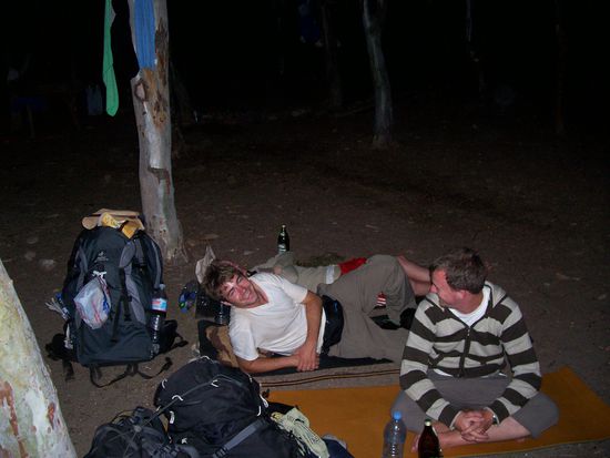 Dumm war nur, dass wir am gesamten Strand keinen Ort finden konnten, wo wir mit 4 Leuten wirklich windgeschützt hätten schlafen können bis auf einen...5 Meter Luftlinie von der Behausung des Nudistenpärchens entfernt hinter einem kleinen Busch. Wir hatten alle nicht die geringste Lust als Spanner zu gelten, aber es gab wirklich keinen anderen Ort zum schlafen und außerdem waren die beiden nicht "zu Hause". So legten wir uns mit unseren Isomatten irgendwann schließlich hin und beobachteten, wie die Sonne langsam den Strand verließ. Es roch zwar die ganze Zeit ein wenig nach Hundepisse, aber wir hatten in diesem Urlaub schon genug Nächte draußen verbracht, und da greift die Murphy-Regel: "Etwas in der Nähe stinkt immer". Außerdem darf man sich nicht beschweren, dass das Katzenklo müffelt, wenn man zum schlafen in den "Flur" fremder Leute einbricht.