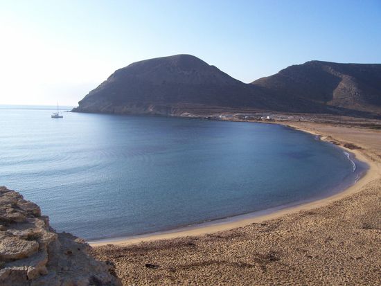 Nach dem Aufbau der Zelte am Campingplatz machte jeder was er wollte. Weil ich Lust hatte Zeitung zu lesen ging ich nach Las Negras um dort eine zu kaufen. Die Stadt ist vom Campingplatz durch einen kleinen Berg getrennt, trotzdem beträgt die Gehzeit nicht mehr als 10 Minuten. Oben auf dem Berg angekommen sah ich dann bei einem Blick auf den Strand, dass sich hier das Verhältnis zwischen spärlich Bekleideten und Splitternackten massiv zu Gunsten letzterer verschoben hatte. Tatsächlich ist das dann aber auch nicht weiter verwunderlich, denn direkt über Las Negras liegt San Pedro, DER Wahlfahrtsort für "Hippies" alter Schule, Aussteiger, Esoteriker. Trotz einiger Versuche seitens der Polizei die Leute durch Razzien zu vertreiben besteht ein harter Kern ununterbrochen fort, um den sich immer mehr Zuzöglinge gruppieren.