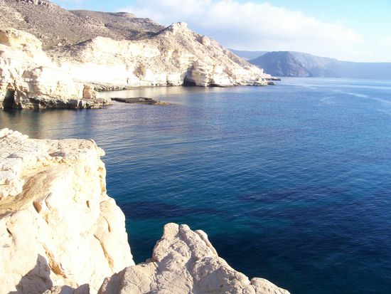 Am nächsten Morgen ging es zunächst wieder auf der Straße weiter in Richtung Norden. Dann kamen wir jedoch an eine Abzweigung, das Schild zeigte weiter geradeaus, wir entschlossen uns aber rechts abzubiegen, weil auf meiner Karte vermerkt war, dass es sich beim dortigen Strand um einen sehenswerten Punkt handelt. Nun, kurz gesagt: Die Karte hatte nicht gelogen, und die nächste Stunde war landschaftlich das mit Abstand Spektakulärste des gesamten Nationalparks Gabo de Gata (Explizit war das hier die Küstenlinie zwischen Camping "La Caleta" im Norden und dem Berg Cerrico Romero im Süden).