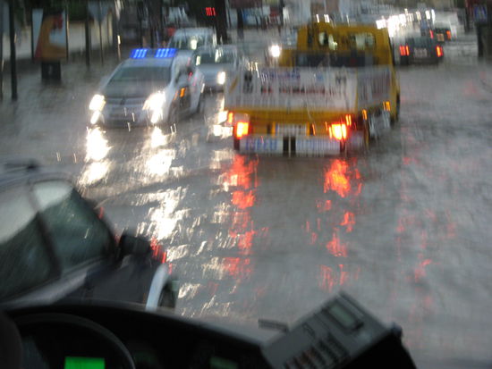 Unser Busfahrer jedoch war die Ruhe selbst und so fuhren wir im Slalom an den im Wasser eingeschlossenen Wagen vorbei. Ampeln gelten auch schon bei normalen Verhältnissen mal mehr, mal weniger, heute fuhren wir durchgehend über rot, quasi eine "rote Welle".