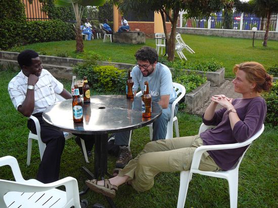 Heute ist unser Abschlussabend hier in Kampala, d.h. der letzte richtige Abend unter Ugandern im Hotel. Nach einem anstrengenden Tag der Erledigungen - mich ausgenommen, denn ich verweilte mit Heimito von Doderers 'Die Daemonen' im Hotelzimmer. Edith und Maria shoppten nochmals quer durch die City und sind jetzt komplett fertig, was ihnen in unserem Hotel zum Vorteil gereicht: Die zentrale Lage am City Square bringt naemlich naechtliches Dauerhupen und spaete (oder fruehe) Gesangseinlagen mit sich. Da braucht man schon einen guten Schlaf - dem wir mit ein paar 'Club' (unser bevorzugtes ugandisches Bier) nachhelfen werden, denn morgen erwartet uns ohnehin eine kurze (in Bezug auf den Schlaf) bzw. lange Nacht in Entebbe.