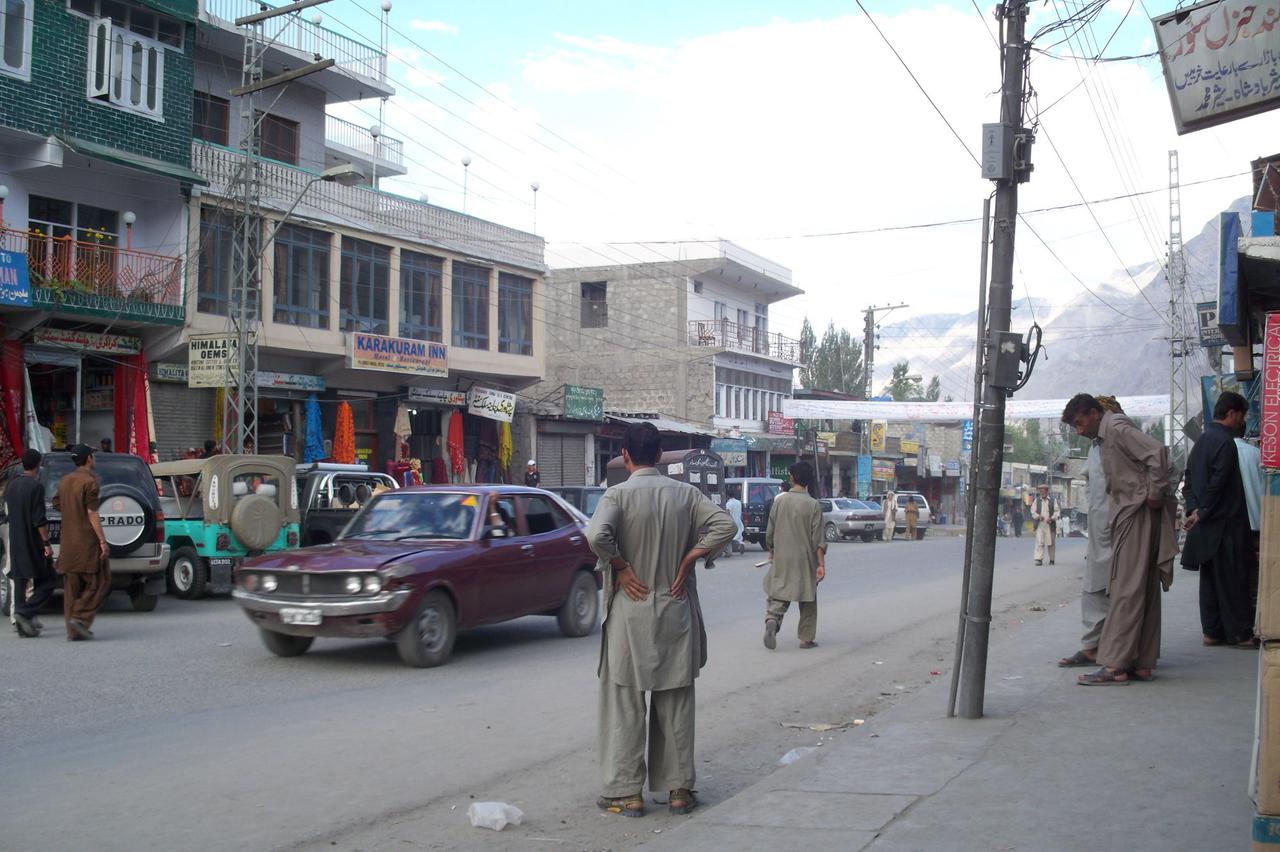 Skardu City!Skardu ist Ziel der Trekkingtouristen, Bergsteiger und Expeditionen, die zu den Bergen des Karakorum-Gebirges unterwegs sind. Hier werden die letzten Besorgungen getätigt und die Fahrzeuge organisiert, die ins Shigar-Tal, nach Dassu, Arandu und Askole (K2) fahren. Gegenüber das Hotel Karakorum-Inn.