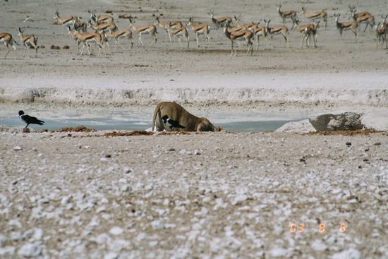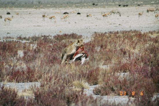 Die Bildausbeute war absolut Spitze. Dank dem 300 mm Objektiv und der Digitalkamera nahm der alleine der Kopf mit der blutigen Schnauze die ganze Bildgröße ein. Die nächsten 2 Tage schaute sich die ganze Familie immer wieder diese sensationell guten Bilder an. Ich war richtig verliebt in meine Löwin, der Zebra-Fresserin von Okaukuejo. Doch wo sind diese genial guten Bilder? Nein, siw sind nicht im Album bzw. im Tagebuch. Doch dazu mehr am 08. August 2003