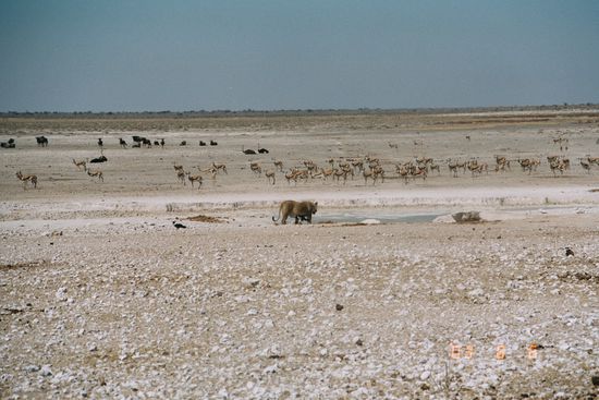 Der 3 Kilometer lange Abstecher zum Etosha Lookout war einfach genial. Der Weg führte hinab an den Rand der Salzpfanne. Erlaubt oder nicht. Wir stiegen aus. In Richtung Norden war freie Sicht bis zum Horizont, bis die topfebene Salzpfanne und der darüber gespannte Himmel sich irgendwo trafen und sich ineinander verschmolzen. Hier konnte man von Einsamkeit sprechen. Kein Mensch und auch sonst kein Lebewesen soweit das Auge reicht. Ungefähr 110 km x 60 km dehnt sich "Etosha" = "großer weißer Patz" aus. Meist ist die gesamte Fläche ausgetrocknet. Nur selten, in sehr regenreichen Jahren, bringen kurzzeitig einige Flüsse Wasser in einen Teil der Ebene.