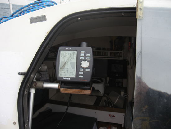 Doch im Landschatten wage ich es, nur mit der Arbeitsfock, bis Stralsund weiterzusegeln. Das geht sogar besser als erwartet, so dass ich noch durch die Ziegelgrabenbrücke gehe und mir im Strelasund, möglichst hinter einem Waldstück, einen halbwegs ruhigen Ankerplatz suchen will. Mit der Seekarte auf dem Knie und der Hand fest an der Pinne glaube ich, gut vorbereitet zu sein, da muß doch ausgerechnet 100 Meter vor meinem Ankerplatz eine Schauerböe mit voller Wucht hereinhauen. Ich luve zum Ankerwerfen an, setze den Autohelm auf die Pinne zum Kurshalten und krieche nach vorn zum Ankerwerfen. Alles klappt wie vorgesehen, aber als ich den Autohelm wieder von der Pinne nehme, spielt das gute Stück verrückt, die Elektronik ist am Ende.