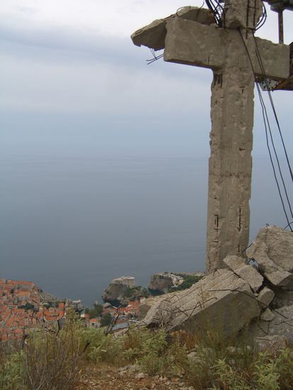 Ein toller Tip von Alfred Müller (der die Anfahrt allerdings nicht ganz korrekt beschrieben hat, das holen wir jetzt nach): wir fahren aus Dubrovnik auf die "8", nicht weit hinter dem Ortsausgangsschild geht es von der "8" nach links, den Berg hinauf Richtung Bosanka. Wenn man einfach nach Gefühl immer bergauf fährt, landet man auf dem Sergiusberg, einer Art Hausberg von Dubrovnik, 412 m hoch. Von unten kann man den Berg natürlich auch sehen, markant ist die ehemalige Seilbahn, welche während des Krieges in den 90ern zerstört wurde. Oben angekommen fallen sofort die Ruinen auf, kein gutes Gefühl. - Dennoch der Blick auf die Altstadt ist umwerfend. Wir haben die Motorräder so nahe wie möglich an den Rand des Berges gefahren, dort oben unsere Picknikausrüstung entfaltet und das gerade in Dubrovnik gekaufte frühe Abendessen verspeist. Das sind diese Momente....
