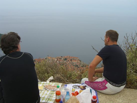 Wir haben die Motorräder so nahe wie möglich an den Rand des Berges gefahren, dort oben unsere Picknikausrüstung entfaltet und das gerade in Dubrovnik gekaufte frühe Abendessen verspeist. Das sind diese Momente....