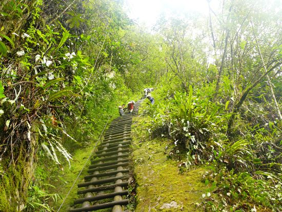 Am fruehen Morgen sind wir erstmal mit dem Bus Richtung Aguas Calientes gefahren. Ca. 20 km vor dem Ziel war Stop und wir sind dann immer den Bahngleisen entlang zu Fuss weiter. Der Trek war nich so aufregend, ausserdem hat es die meiste Zeit geregnet. So hatte ich nicht mal Lust Fotos zu machen. In Aguas Calientes angekommen hat uns Chico in unser exklusives Hostal gebracht. Nach einer eher lauwarmen bis kalten Dusche, habe ich (Patrice) mich noch mit 3 anderen Mitreisenden auf den Weg zum Putucusi (2500 m N.N) gemacht. Dieser Berg liegt gegenueber des Machu Picchu und bieten einen super Ausblick auf diesen. Da es ja zuvor die ganze Zeit geregnet hatte war der Aufstieg nur auf eigene Verantwortung erlaubt. Klar, so eine 50m Leiter aus Holz senkrecht an einer Felswand ist nicht ohne.