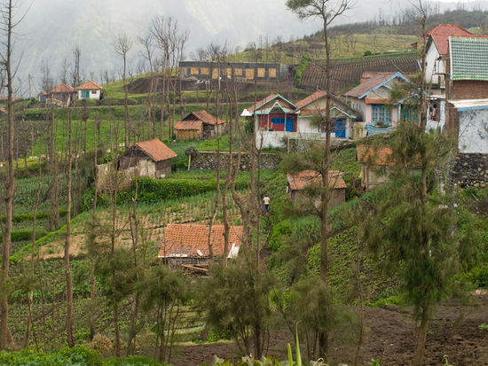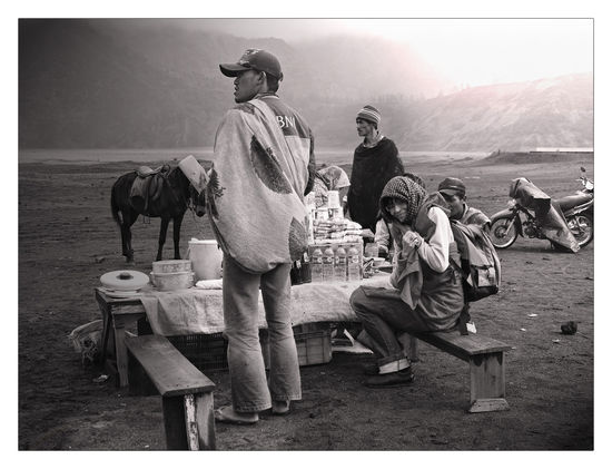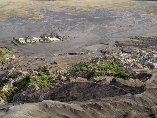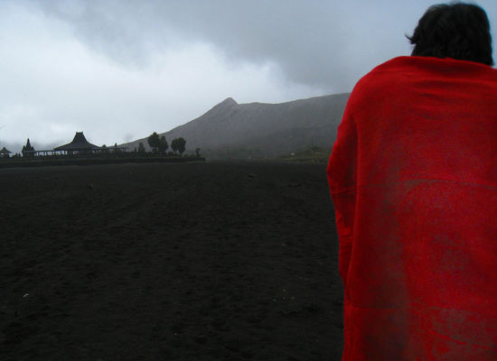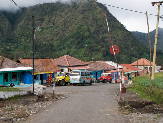 wir waren nicht die einzigen, die schon so frueh auf den beinen waren und ploetzlich sahen wir eine ganze hand voll touris und fragten uns, wo die sich denn wohl gestern nachmittag und abend im dorf versteckt hatten? die touris kamen scheinbar alle aus der gleichen unterkunft und hatten eine jeeptour gebucht. wir ueberlegten, ob wir es evtl. nocheinmal wagen und per jeep zum aussichtspunkt fahren sollten, oder ob das wetter uns wieder einen strich durch die rechnung machen wuerde. oder sollten wir heute lieber nur die etwa 1,5 stuendige strecke zu fuß von hier aus durch die stockdunkle kratermondlandschaft zum mount bromo gehen? hm, wir entschieden uns doch noch einmal fuer den aussichtspunkt! den jeep konnten wir uns mit einem paerchen aus den niederlanden teilen und bezahlten diesmal dann bloß IDR 210.00 (halb so viel wie gestern), das ging in ordnung.